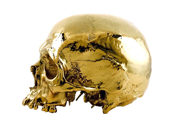 In addition to his luxurious bookends, cabinet knobs, napkin rings, trays, boxes and objets d'art, Eduardo Garza dips replicas of full adult-sized Human, Gorilla, Tiger, Alligator, Warthog and Saber Tooth skulls - and a Shark's jaw - in real 24k gold to make a decorative object that is hard to ignore.